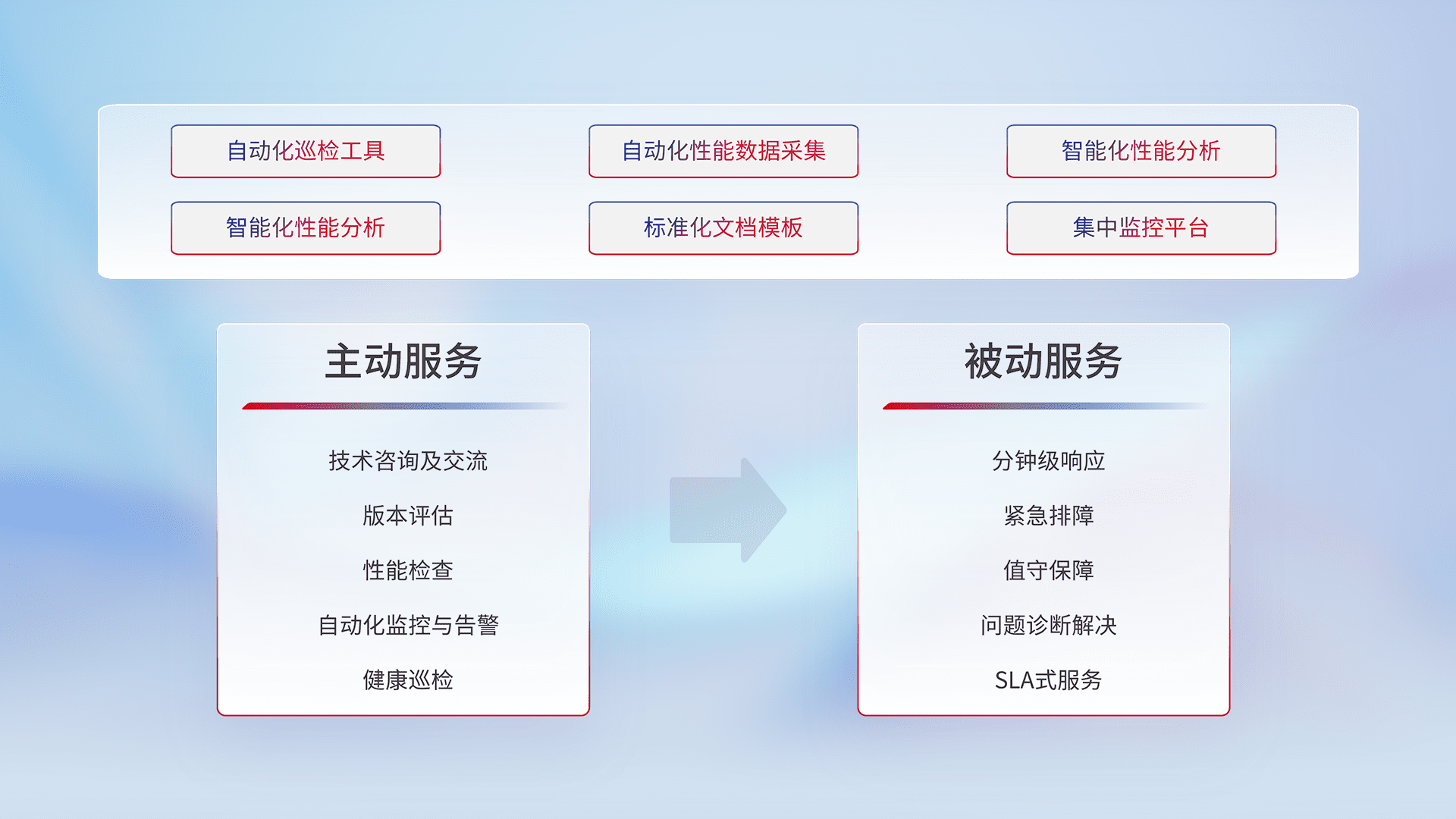 智能化工具和标准化文档,,保障服务质量,,提供主动服务(包含技术咨询、、、、版本评估、、性能检查、、、自动化监控与告警、、健康巡检)和被动服务包含(分钟级响应、、、紧急排障、、值守保障、、问题诊断解决、、SLA服务)。。。。